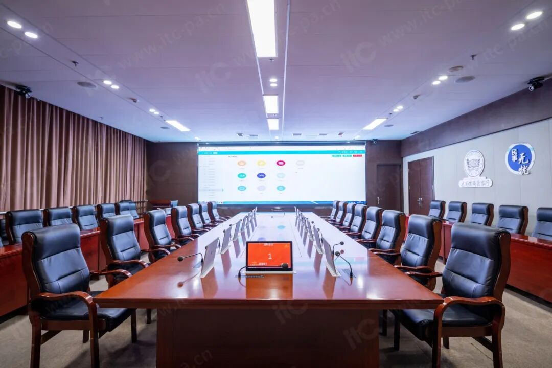 為創新會議管理新模式,提高信息化、數字化政務服務效能, itc保倫股份為濟寧市行政審批服務中心會議室精心定制了一套無紙化會議&數字會議&專業擴聲&遠程視頻會議&智能中控等音視頻系統設備,以整合政務中心信息資源,優化政務中心工作流程,實現會議資源有效共享、會議進程井然有序、跨部門協作高效協同,切實提升審批服務中心政務管理效能。審批服務中心會議室主要用于召開各類專題會議、培訓交流會、日常工作會議等,為保障部門工作更順暢開展, itc根據會議室席位和功能布局,為其部署了16套無紙化會議系統,配備15.6英寸觸摸超薄液晶升降一體機,自帶高靈敏陣列數字會議話筒。該系統的安裝應用,改變了傳統的會議模式,實現了從會前、會中、會后全流程智能化會議管理。